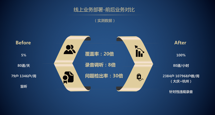 产品部署上线后根据实测数据报告显示,语音质检覆盖率由原来的5%提升到100%;每天质检员只能盲目抽查80通电话进行质检,到现在对针对性违规录音每小时就能抽查80通;问题检出率提高了近30倍,对比系统运行前后数据,运营效率大幅提升,可量化可衡量可视化的多维数据分析,帮助51信用卡为客户提供更加流畅的互动体验服务。